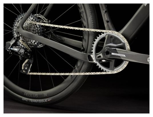 Le vélo roule sur des roues Bontrager Aeolus Pro 3V en carbone, tubeless-ready, avec jantes de 25 mm de largeur. Les pneus sont des Bontrager GR1 Team Issue 700x40C, 120 tpi.