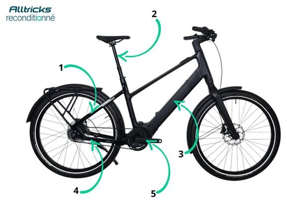 Ce vélo est issu d’un parc test Winora. A la suite de son contrôle qualité, de légers dommages ont pu être constatés (voir photos avec flèches).
