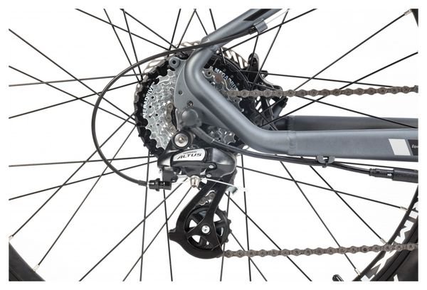 Munie d’un cadre – Alu – 6061 ce VTT électrique a une autonomie allant jusqu’à 120 km* et est capable d’atteindre facilement la vitesse maximale régulée de 25 km/h grâce à son moteur de 250W et 55Nm de couple. Un freinage – sec – ne pose aucun problème grâce à ses freins à disques hydrauliques avant et arrière, équipé Full SHIMANO, ALTUS à 24 vitesses (modèle Shimano ALTUS RD-M310L). Son guidon oversize de 700 mm (plus épais au milieu) permet une conduite plus confortable et plus précise, soutenue par une fourche avant Suntour XCM à suspension hydraulique, avec blocage et débattement de 120 mm. Son display dernière génération nous indique à tout moment le niveau d’assistance, ainsi que la vitesse, la distance parcourue et la capacité de la batterie. C’est aussi un VTT très polyvalent, car il peut aussi être utilisé quotidiennement en ville.