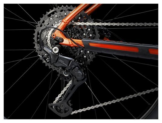 Un cadre léger en aluminium doté d’une géométrie moderne adaptée au trail et d’un acheminement interne des câbles afin de les protéger et de conserver l’élégance du vélo. Une fourche télescopique avant RockShox Judy de 100 mm qui amortit l’impact contre les pierres, les racines et les bosses sur les sentiers, une transmission fluide à 10 vitesses Shimano CUES et la puissante force de freinage de freins à disque hydrauliques.